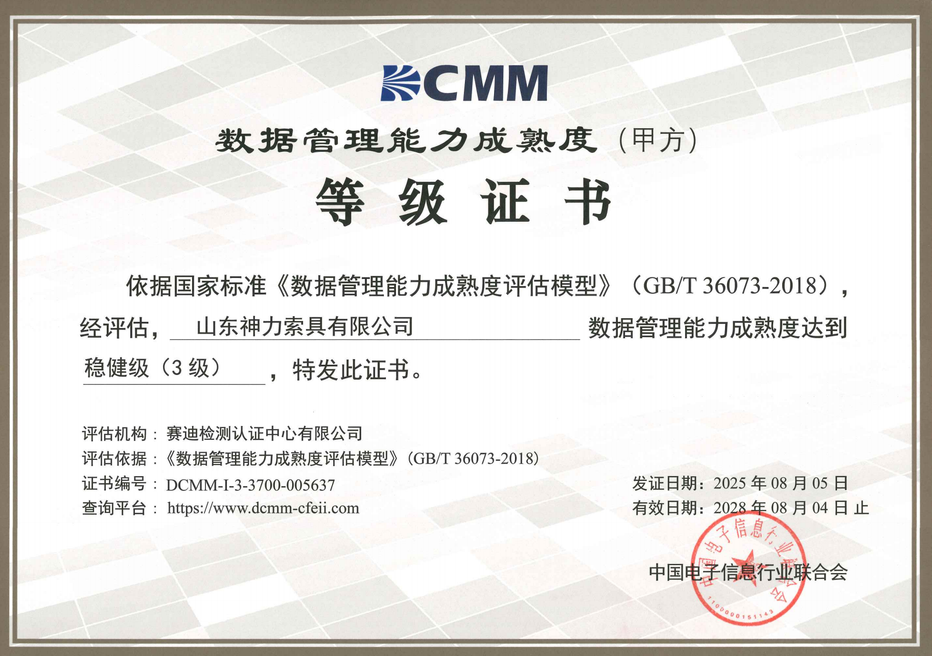 近日,神力索具正式通過(guò)賽迪檢測(cè)認(rèn)證中心有限公司的嚴(yán)格評(píng)估,榮獲國(guó)家《數(shù)據(jù)管理能力成熟度(甲方)等級(jí)證書(shū)》,能力等級(jí)達(dá)到穩(wěn)健級(jí)(3級(jí))!這是依據(jù)國(guó)家標(biāo)準(zhǔn)《GB/T36073-2018 數(shù)據(jù)管理能力成熟度評(píng)估模型》進(jìn)行的權(quán)威認(rèn)證,含金量十足!
