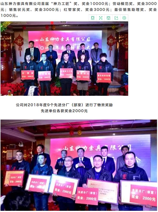 本次年會(huì)回顧了剛剛過去的2018年,在杜亞中董事長、杜大平總經(jīng)理的正確領(lǐng)導(dǎo)下,在社會(huì)各界人士的大力支持下,在全體職工的共同努力下,我們?nèi)〉玫牟黄椒驳臉I(yè)績及來自八方賓客的贊譽(yù)。明確了2019年是神力索具深耕細(xì)作、創(chuàng)新發(fā)展的關(guān)鍵之年,平凡卻也偉大的神力人將再接再厲,再創(chuàng)佳績!