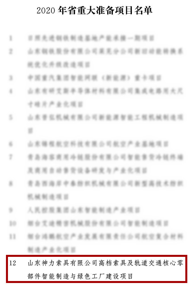 在2020年省重大準(zhǔn)備項(xiàng)目名單中,山東神力索具有限公司榜上有名,我公司提出的“高檔索具及軌道交通核心零部件智能制造與綠色工廠建設(shè)項(xiàng)目”得到省市區(qū)各級(jí)政府的肯定和支持,成功入選“2020年省重大準(zhǔn)備項(xiàng)目名單”!