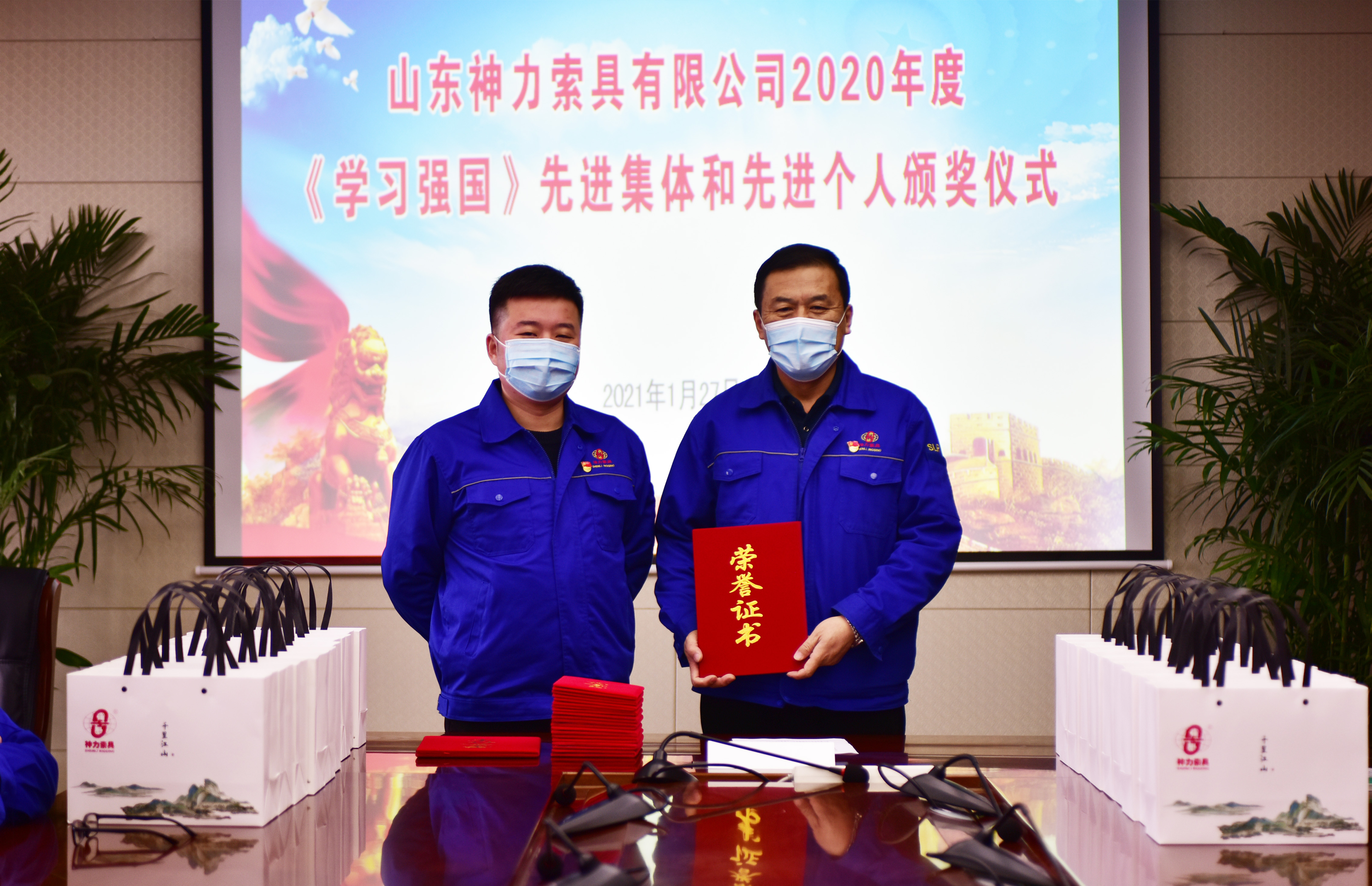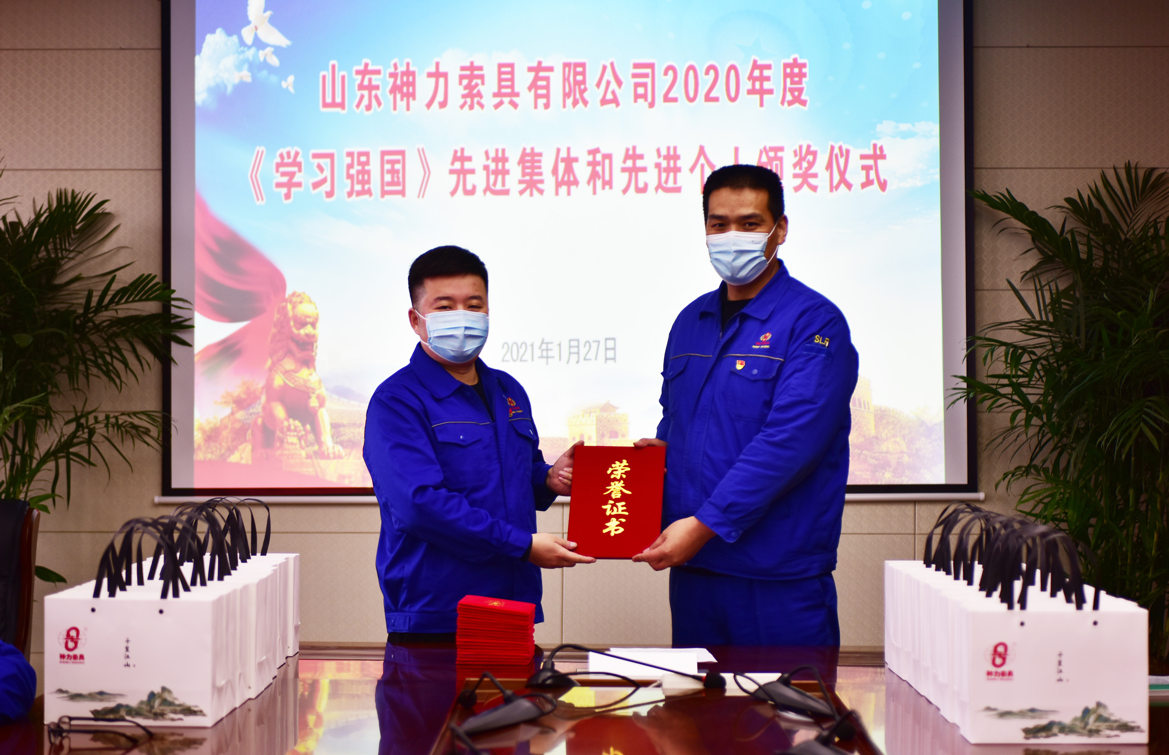 2021年1月27日,山東神力索具有限公司“2020年度學(xué)習(xí)強(qiáng)國先進(jìn)集體和先進(jìn)個人頒獎儀式”在公司黨員活動室舉行,“學(xué)習(xí)強(qiáng)國”學(xué)習(xí)平臺工作小組副組長、工會主席李廣德主持頒獎儀式,“學(xué)習(xí)強(qiáng)國”學(xué)習(xí)平臺工作小組副組長、總經(jīng)理杜大平出席活動并為獲得先進(jìn)集體的代表和先進(jìn)個人頒獎。