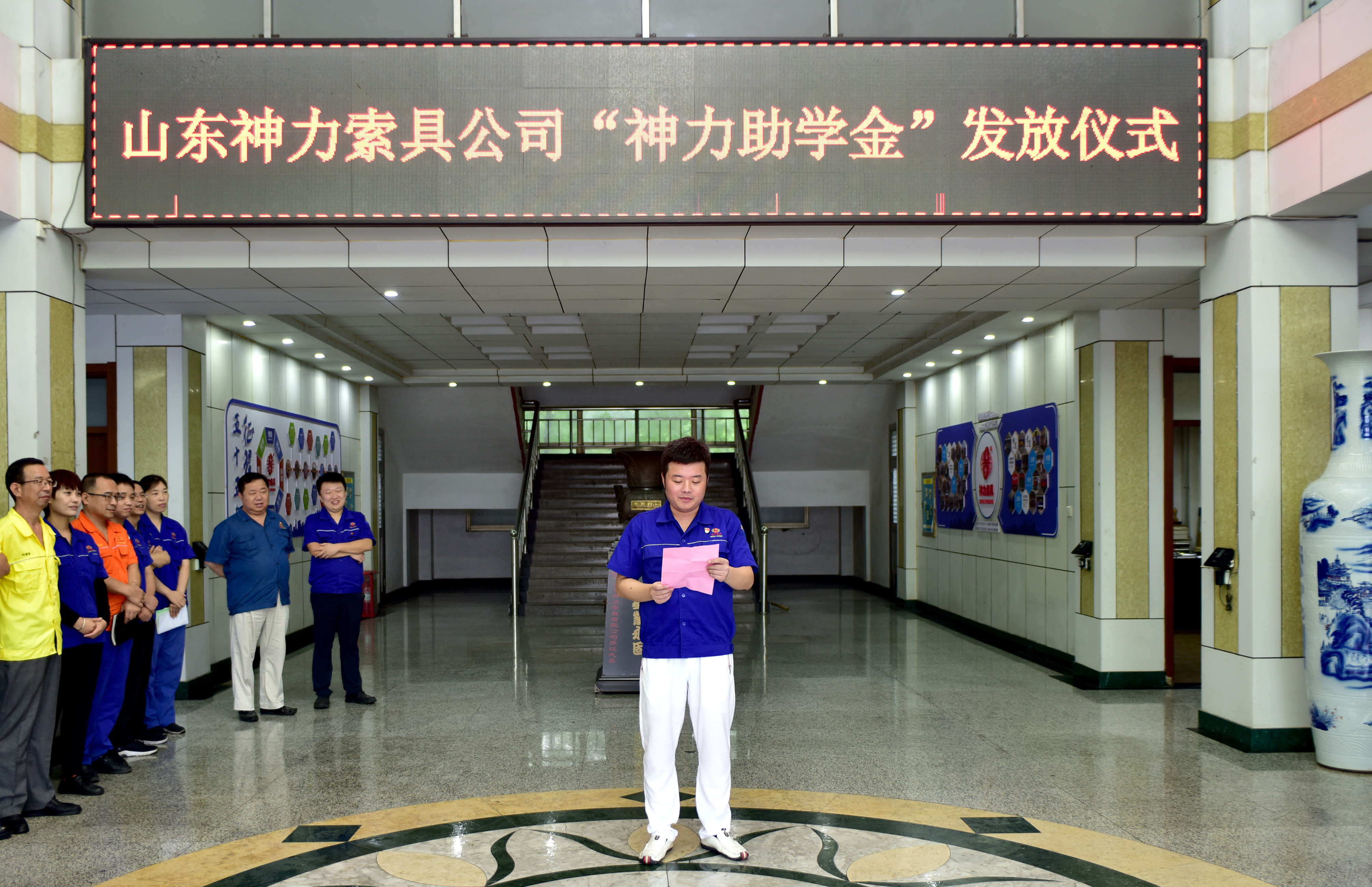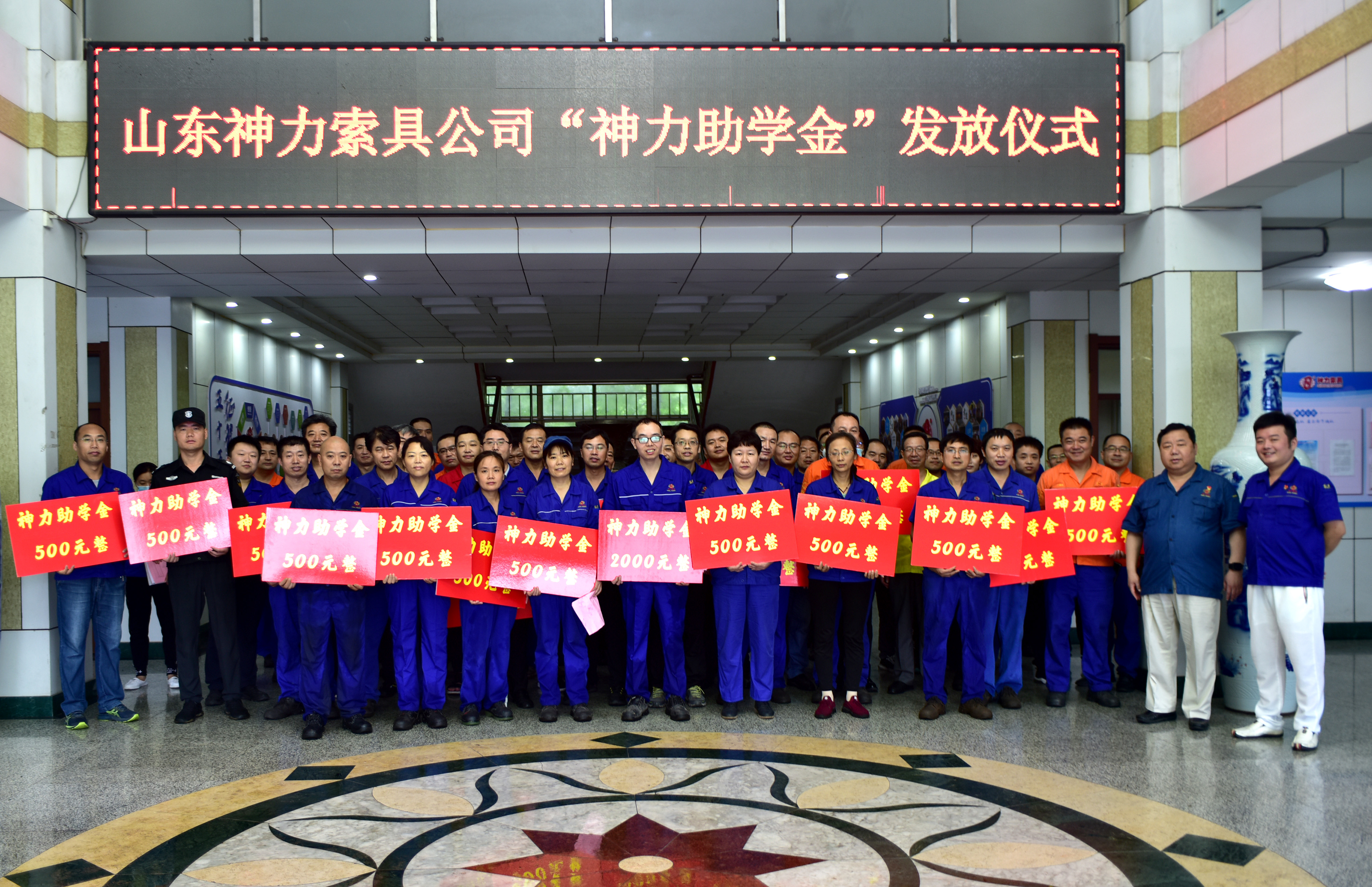8月30日上午, 山東神力索具有限公司在辦公樓大廳為今年夏季高考中金榜題名的19位學子家庭舉行“神力助學金”發(fā)放儀式。公司董事長杜亞中、總經(jīng)理杜大平、常務(wù)副總楊永海、工會主席李廣德、市助企攀登干部馮超等領(lǐng)導出席儀式。