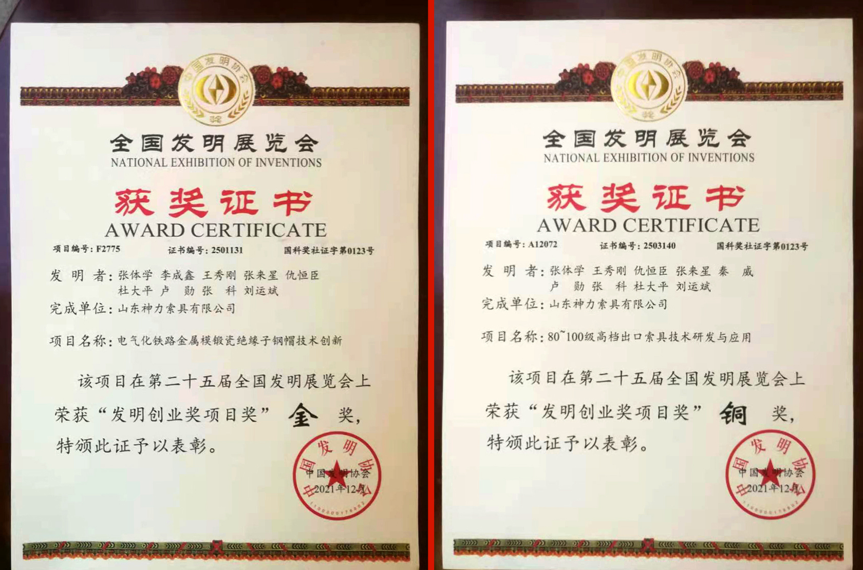 我公司80級、100級高檔出口索具及電氣化鐵路模鍛鋼帽的創(chuàng)新成果和產(chǎn)品,一經(jīng)亮相便得到了與會領導、專家的認可。電氣化鐵路金屬模鍛絕緣子鋼帽技術(shù)創(chuàng)新項目榮獲“發(fā)明創(chuàng)業(yè)獎項目獎”金獎,80級~100級高檔出口索具技術(shù)創(chuàng)新與應用項目榮獲“發(fā)明創(chuàng)業(yè)獎項目獎”銅獎!