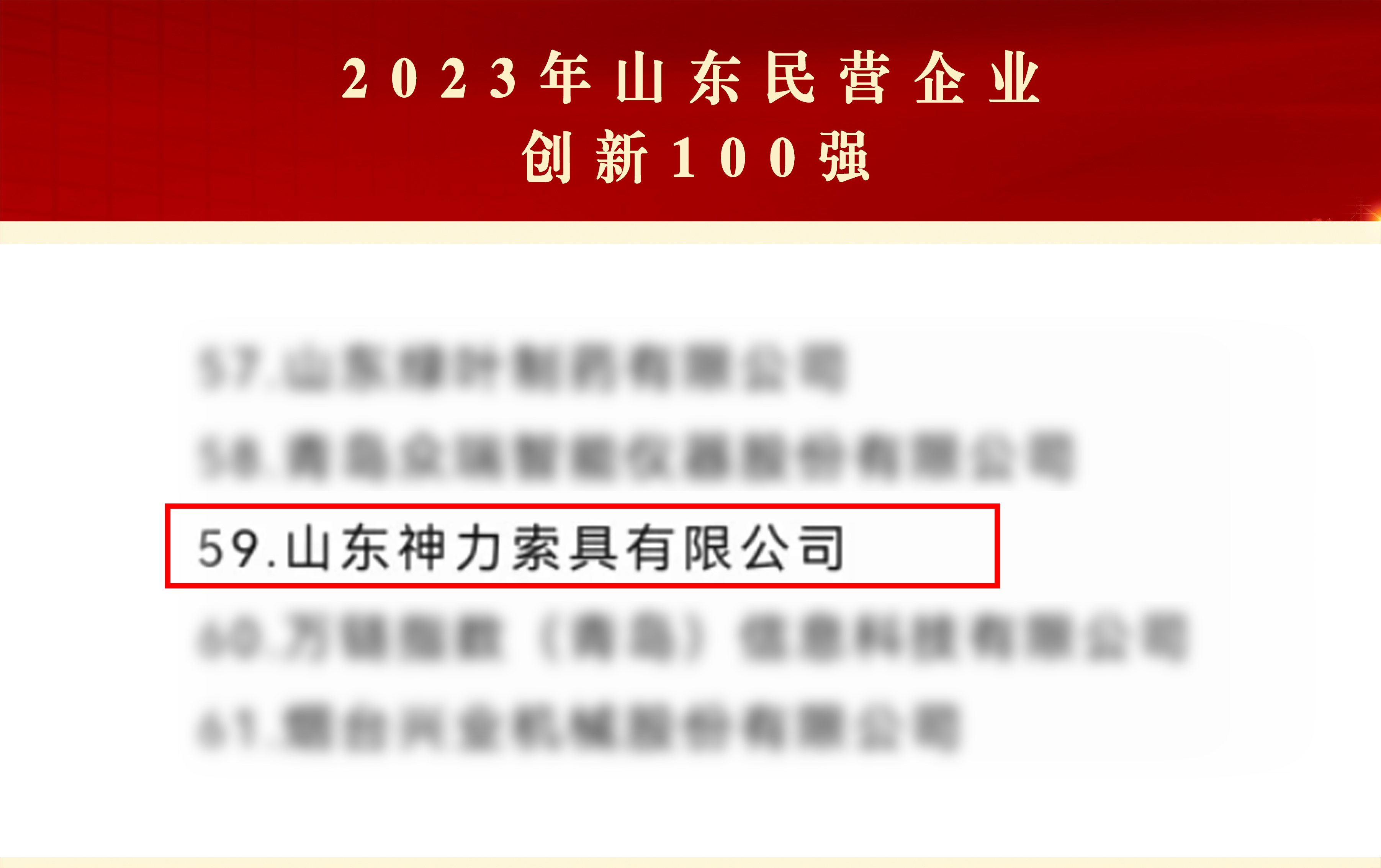 近日,在山東省工商聯(lián)公布的《2023年山東民營(yíng)企業(yè)創(chuàng)新100強(qiáng)》榜單中,神力索具榜上有名,連續(xù)兩年,光榮入選“山東省創(chuàng)新100強(qiáng)民營(yíng)企業(yè)”。