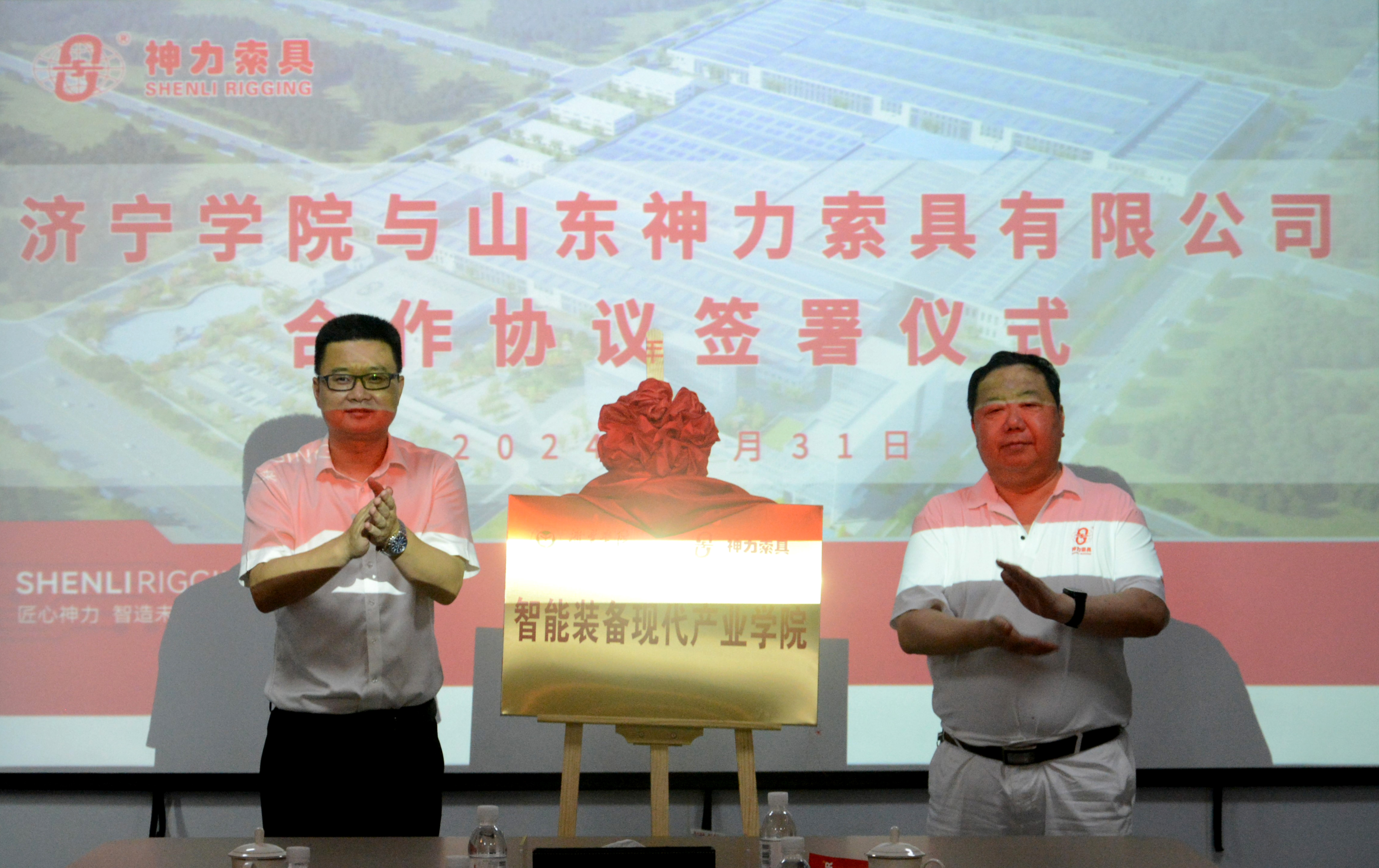濟(jì)寧學(xué)院副校長劉國棟與神力索具黨委書記杜亞中共同為“濟(jì)寧學(xué)院實(shí)踐教學(xué)基地”、“濟(jì)寧學(xué)院-神力索具智能裝備現(xiàn)代產(chǎn)業(yè)學(xué)院”揭牌。劉國棟表示,神力索具作為市域智能制造轉(zhuǎn)型升級(jí)模范企業(yè),是廣大理工科學(xué)子向往的實(shí)踐寶地,通過合作建立該學(xué)院,將大大提高實(shí)踐教學(xué)質(zhì)量,激發(fā)廣大學(xué)子科技創(chuàng)新精神、創(chuàng)業(yè)能力和實(shí)踐能力。校企合作,互利共贏。在未來將形成更多的高質(zhì)量合作成果,推動(dòng)區(qū)域高質(zhì)量發(fā)展。